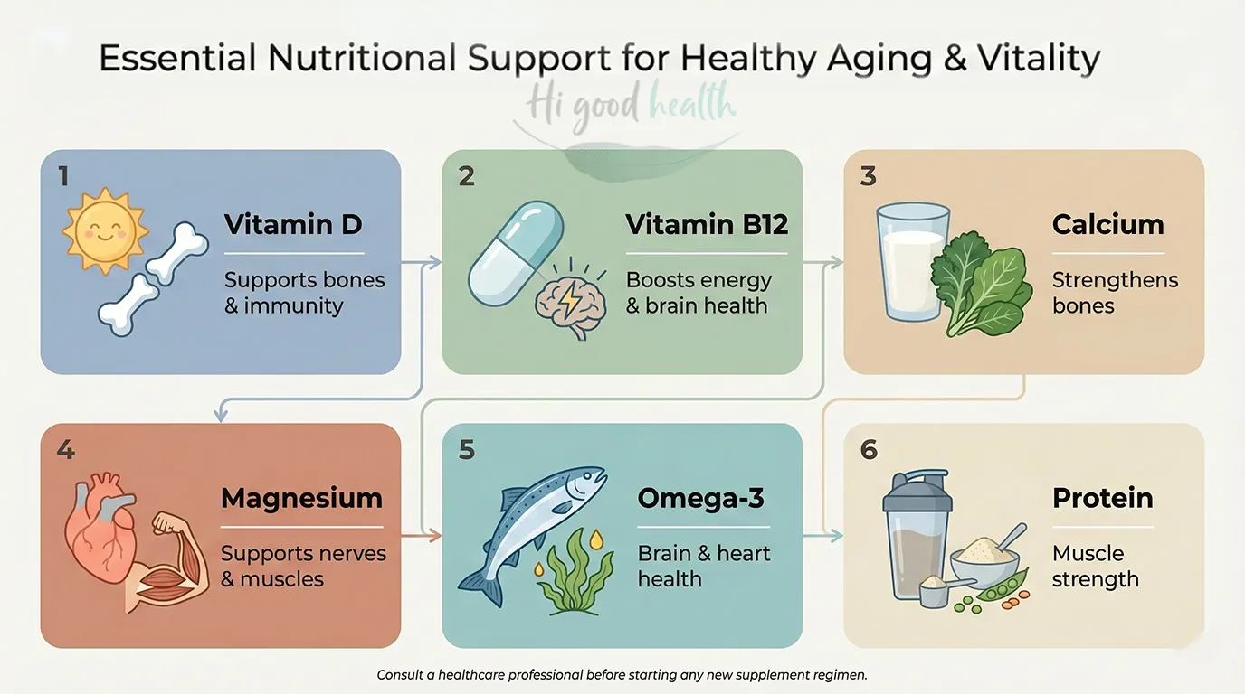 Supplements may help bridge gaps when absorption declines with age, specifically for vitamin D, B12, and calcium. However, targeted supplementation based on individual needs (assessed through blood work) is often more effective and safer than generic multivitamins. Always consult your healthcare provider[6][7].